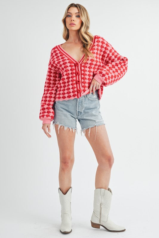 Embrace festive charm with the Fantasia cardigan, featuring a geo crochet pattern using swooping fan shapes in a delightful two-tone color scheme. Finished with elegant mother-of-pearl buttons and a chic tie belt, the Fantasia cardigan is the perfect blend of style and sophistication.